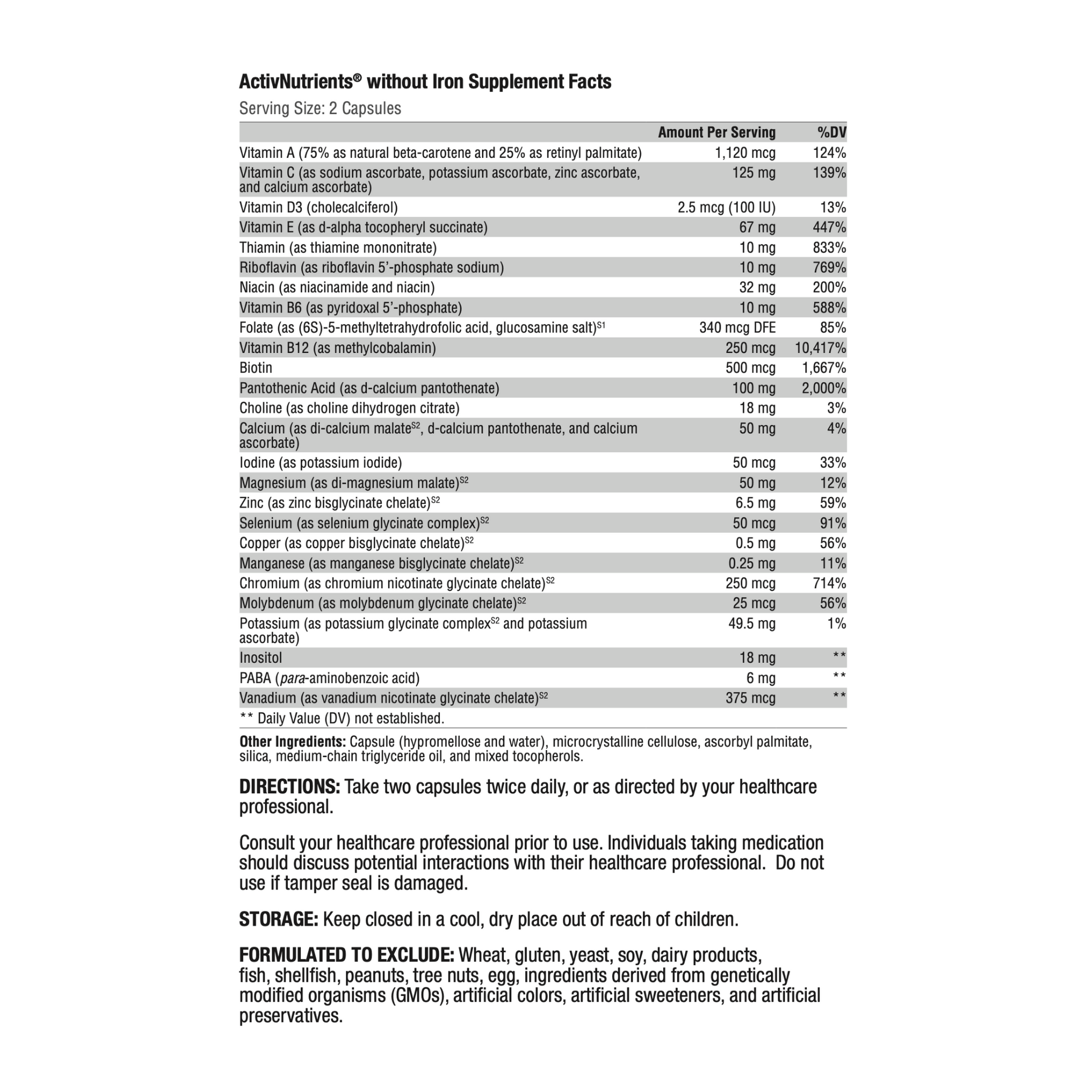 ActivNutrients® without Iron features a premium, multivitamin/mineral blend of high-quality vitamin and mineral forms selected for optimum utilization. The comprehensive nutrient profile is delivered in a vegetarian capsule and supports foundational wellness; provides antioxidant activity with vitamins C and E, selenium, and beta-carotene; and supports detoxification.*