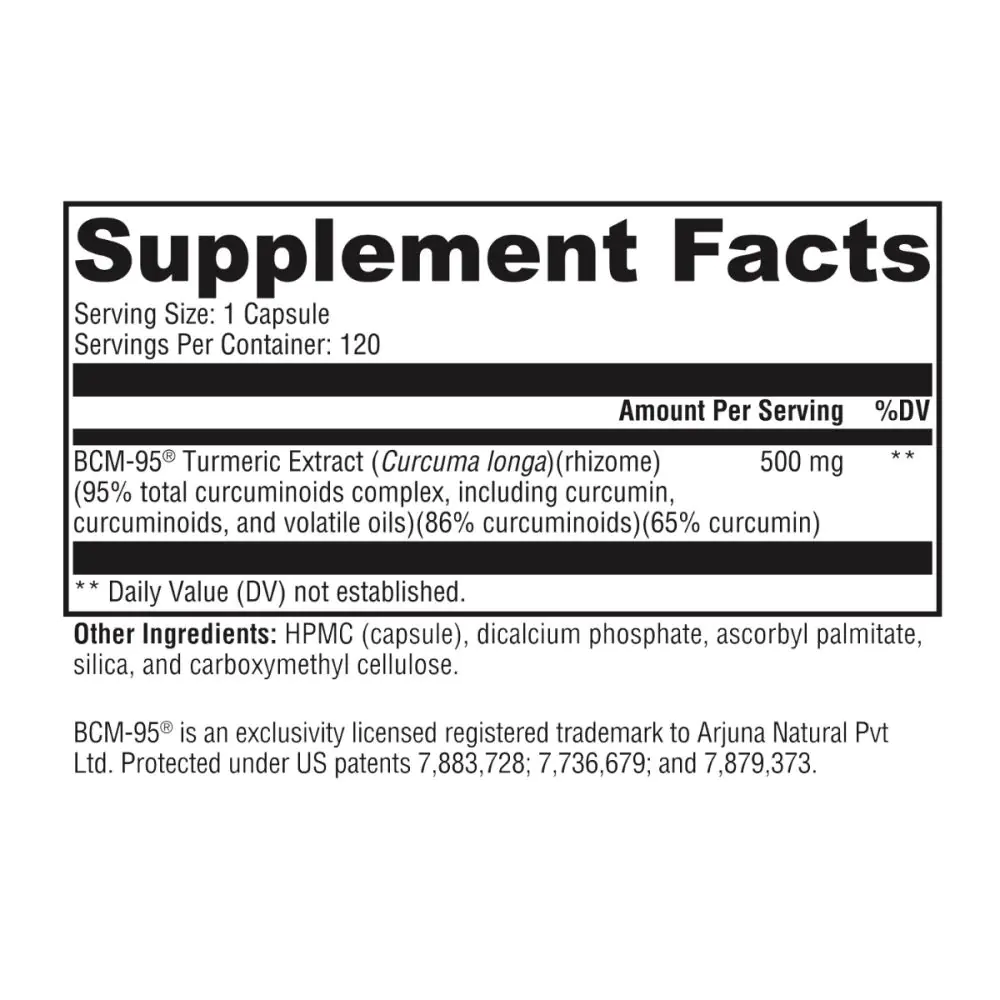 - BCM-95® Turmeric Extract (Curcuma longa)(rhizome) (95% total curcuminoids complex, including curcumin,curcuminoids, and volatile 0ils)(86% curcuminoids)(65% curcumin) 500mg **