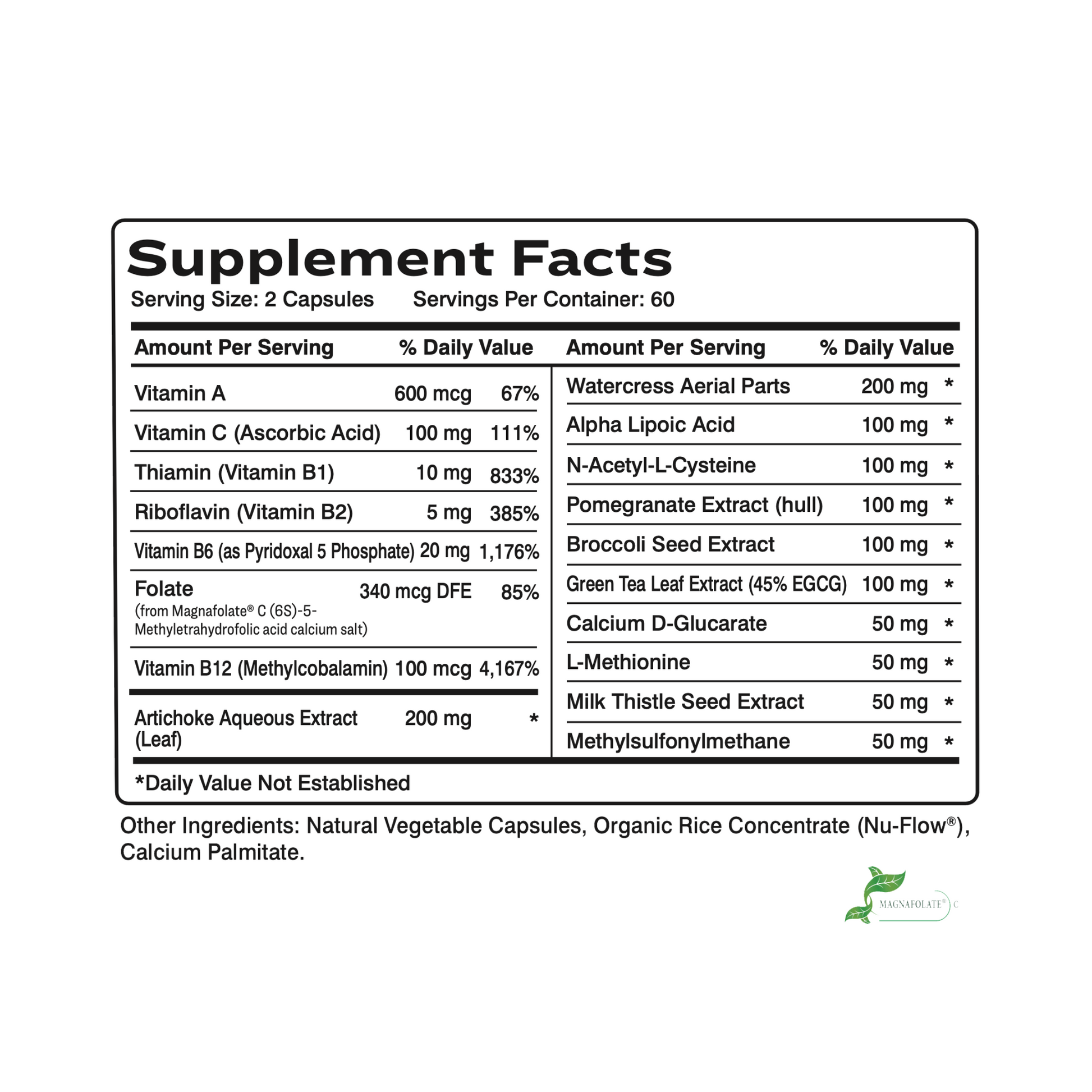 Supporting detoxification can be an important part of overall health. This unique formula provides activated B vitamins, including the highly researched Magnafolate C (6s)-5-Methyltetradhydrafolate optimal folate utilization. Duo Detox provides antioxidant support to minimize the damaging effects of free radicals generated between the two phases.