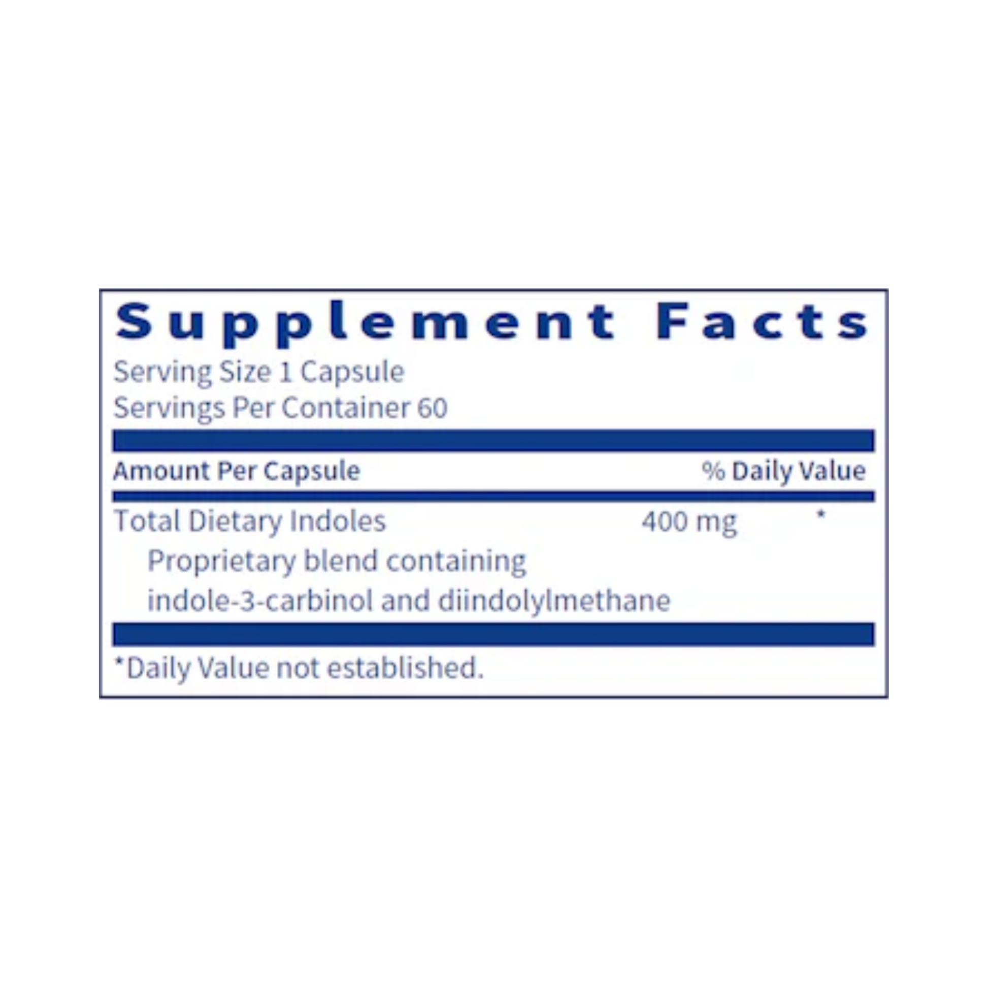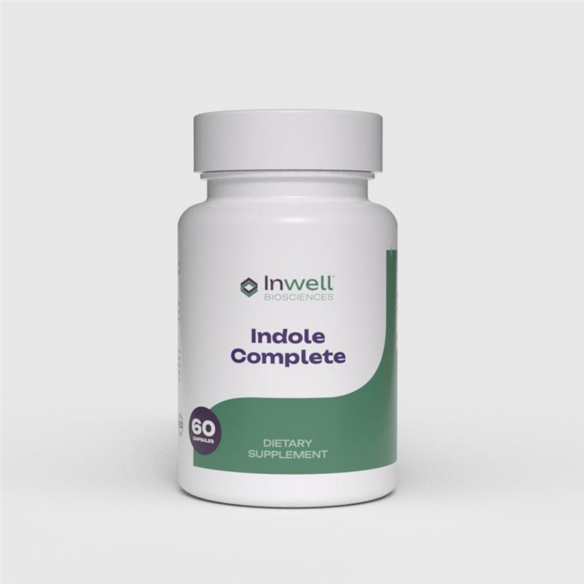 Indole Forté™ contains a mixture of two important dietary indoles, indole-3-carbinol (I3C) and diindolylmethane (DIM). Since I3C undergoes biochemical transformation to related indole metabolites, broad-spectrum indoles may be present upon ingestion.