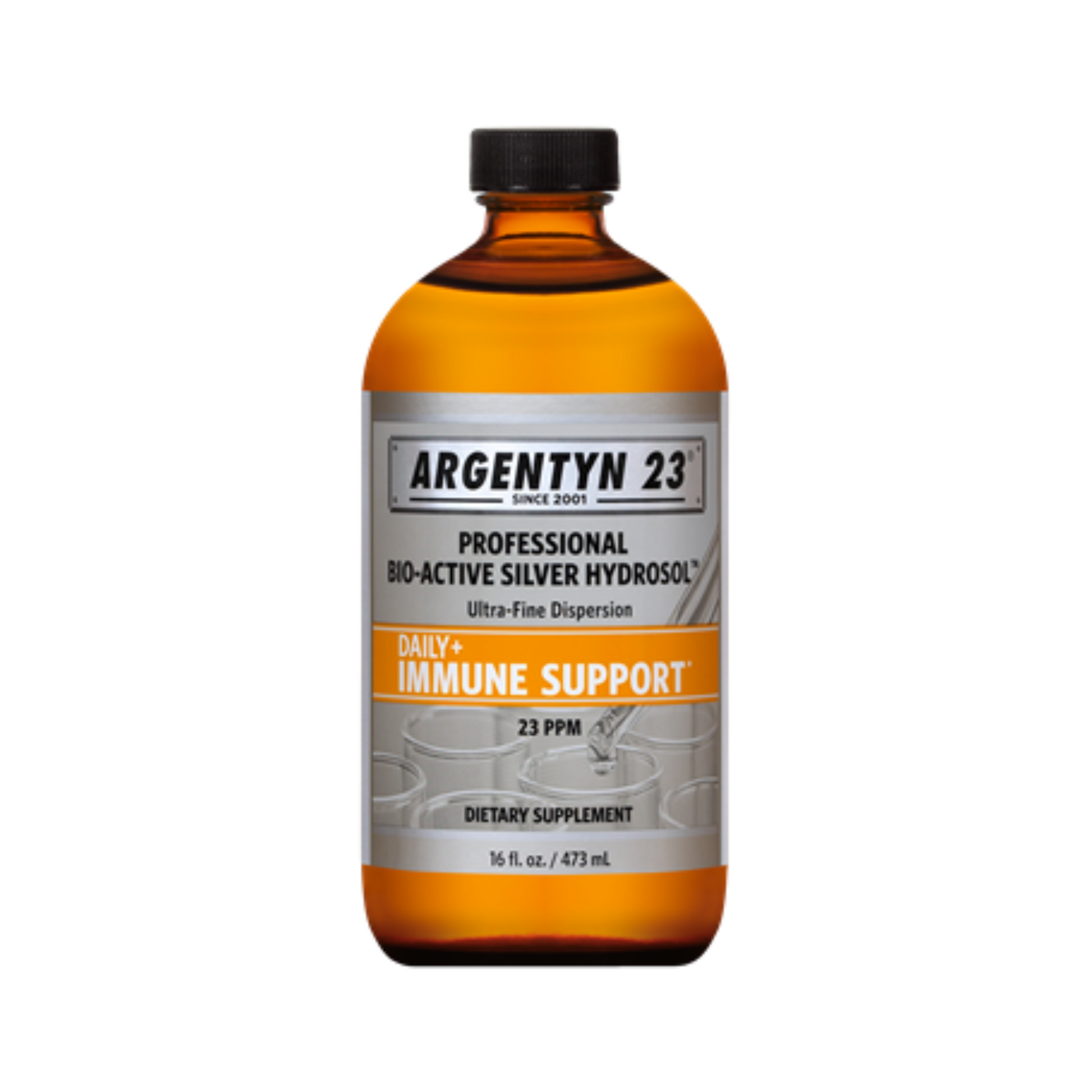 Argentyn 23® Bio-Active Silver Hydrosol™ is composed of only 99.999% pure silver and purified water. The unique combination of >98% positively charged silver ions and nanoclusters of an unprecedented size as small as 0.8 nm, allows for easy absorption and excretion. The low concentration of 23 ppm offers your patients the most effective and safest dietary silver supplement available.*