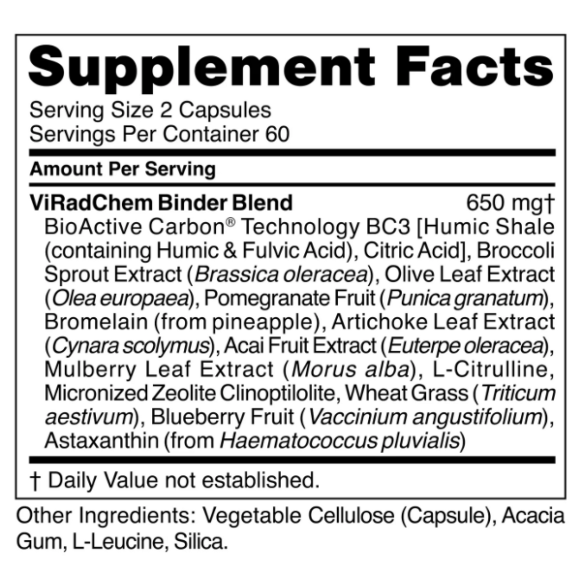 ViRadChem Binder promotes the body’s natural ability to detoxify environmental and microbial contaminants while supporting cellular repair.* Acai, artichoke leaf, broccoli leaf, and wheatgrass are added to lend increased support to the body’s free radical scavenging systems.